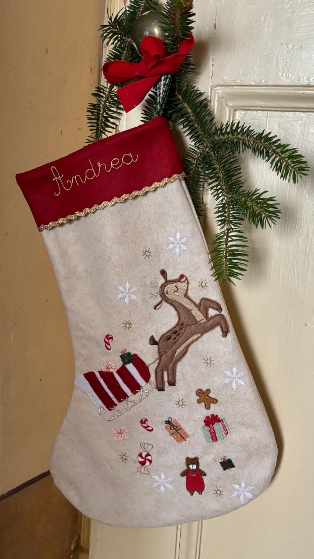 Calza Natalizia in Lana | Personalizzata | Renna e Slitta | Embroidery store Letizia